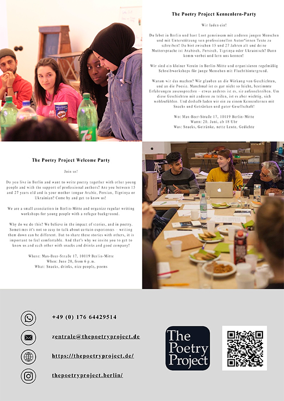 Du lebst in Berlin und hast Lust gemeinsam mit anderen jungen Menschenund mit Unterstützung von professionellen Autor*innen Texte zuschreiben? Du bist zwischen 15 und 27 Jahren alt und deine Muttersprache ist Arabisch, Persisch, Tigrinya oder Ukrainisch? Dann komm vorbei und lern uns kennen!